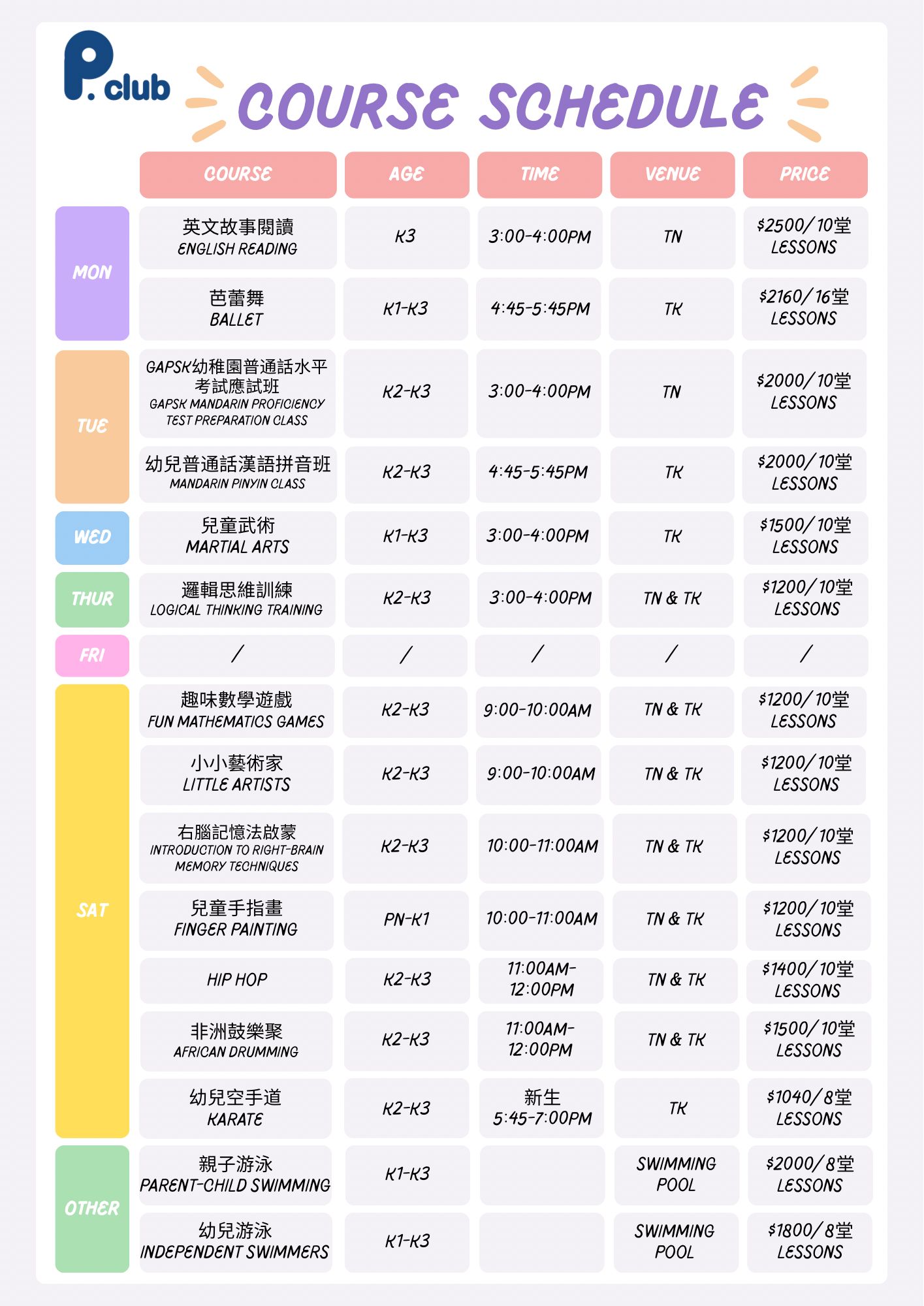 | 游泳 Swimming | 自選 Weekdays/ Weekends | / | $1800-2000/ 8堂 lessons | PN-K3 |
