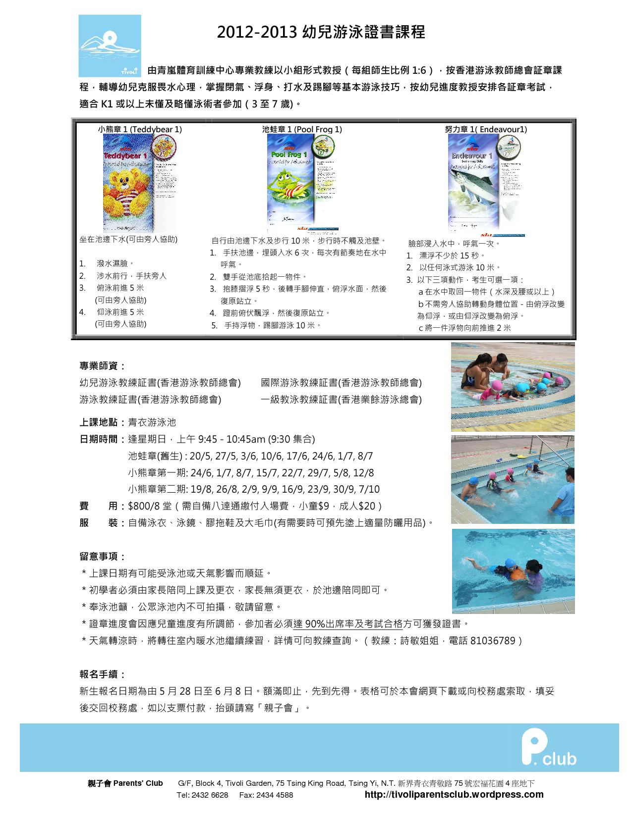 2012-2013幼兒游泳證書課程 04/06/201207/09/2016 Tivoli Parents' Club 本會資訊 按此下載章 上午9:45-10:45的小熊章現已滿額,現加開下午3:15-4:15pm (03:00pm集合),名額有限,欲報從速! Click to email a link to a friend (Opens in new window) Email Click to print (Opens in new window) Print More Click to share on Reddit (Opens in new window) Reddit Click to share on X (Opens in new window) X Like Loading... Related