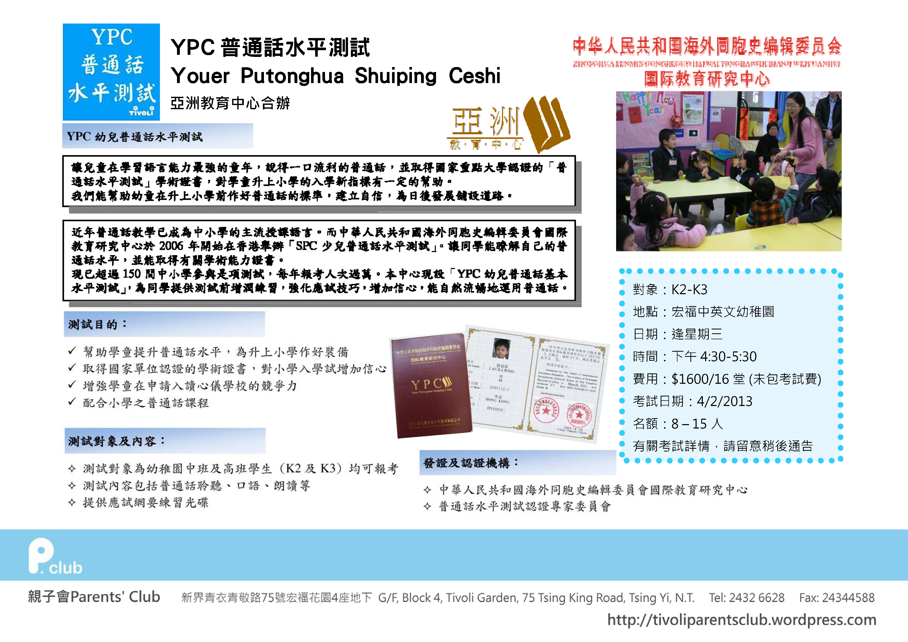 YPC幼兒普通話水平測試課程簡介 27/11/201227/11/2012 Tivoli Parents' Club 本會資訊 「YPC幼兒普通話水平測試」由華南師範大學研發,是全港唯一供幼稚園學生參與的統一公開普通話評核測試。本課程將教授測試內容,涵蓋聆聽、說話和朗讀各方面,內地專業導師會以輕鬆的教學方法,透過圖畫及練習等工具,讓學生學習不同的詞彙及語句,為普通話水平達標的幼兒保薦參加測試。 備 註: 1. 評核人員將到校進行評核測試。 Click to email a link to a friend (Opens in new window) Email Click to print (Opens in new window) Print More Click to share on Reddit (Opens in new window) Reddit Click to share on X (Opens in new window) X Like Loading... Related