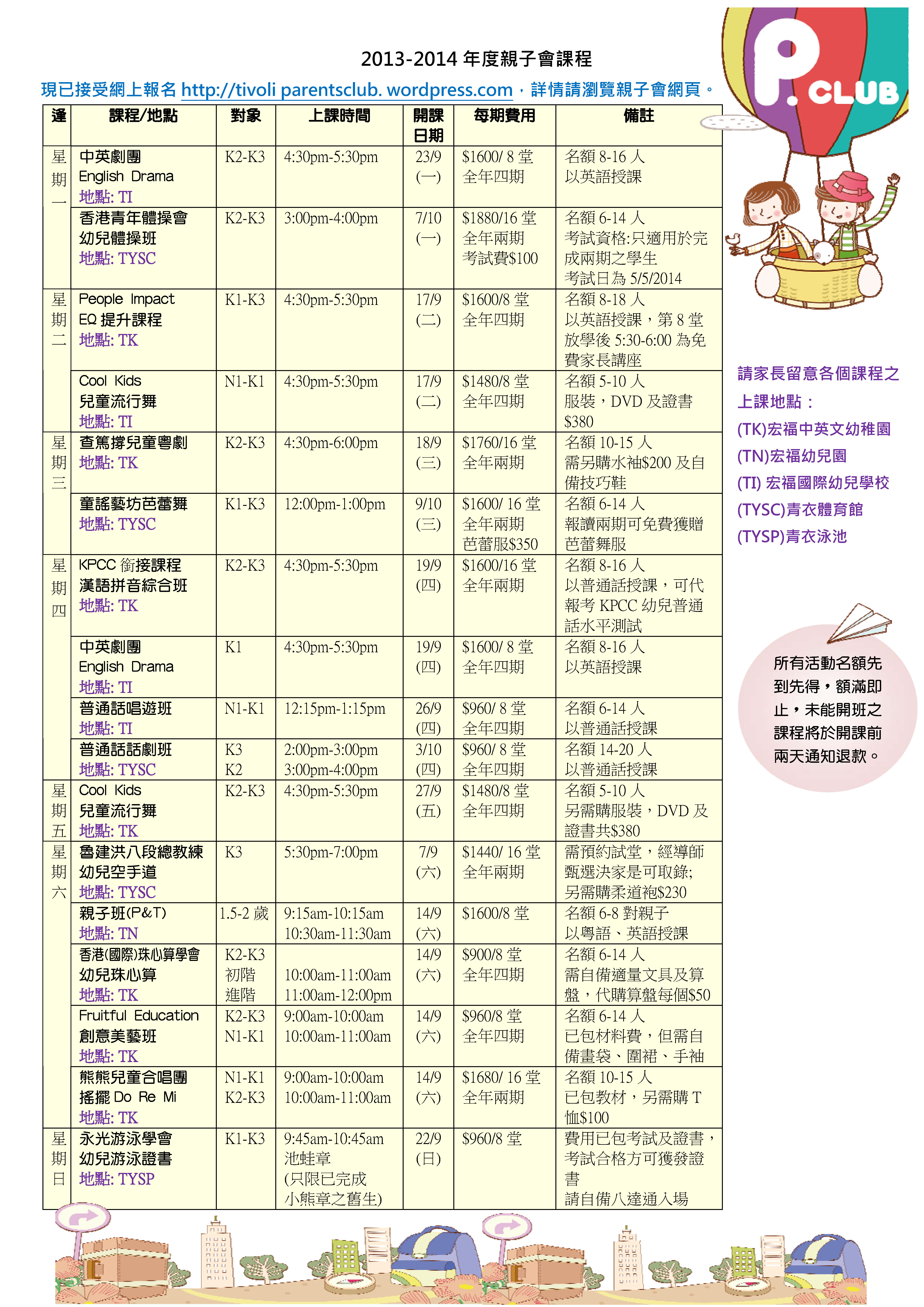 2013-2014年度親子會課程 14/09/201316/09/2013 Tivoli Parents' Club 本會資訊 現正招生,按此連結到網上報名 更新日期:19/9/2013 幼兒體操班及普通話唱遊班上課時間修訂 Click to email a link to a friend (Opens in new window) Email Click to print (Opens in new window) Print More Click to share on Reddit (Opens in new window) Reddit Click to share on X (Opens in new window) X Like Loading... Related