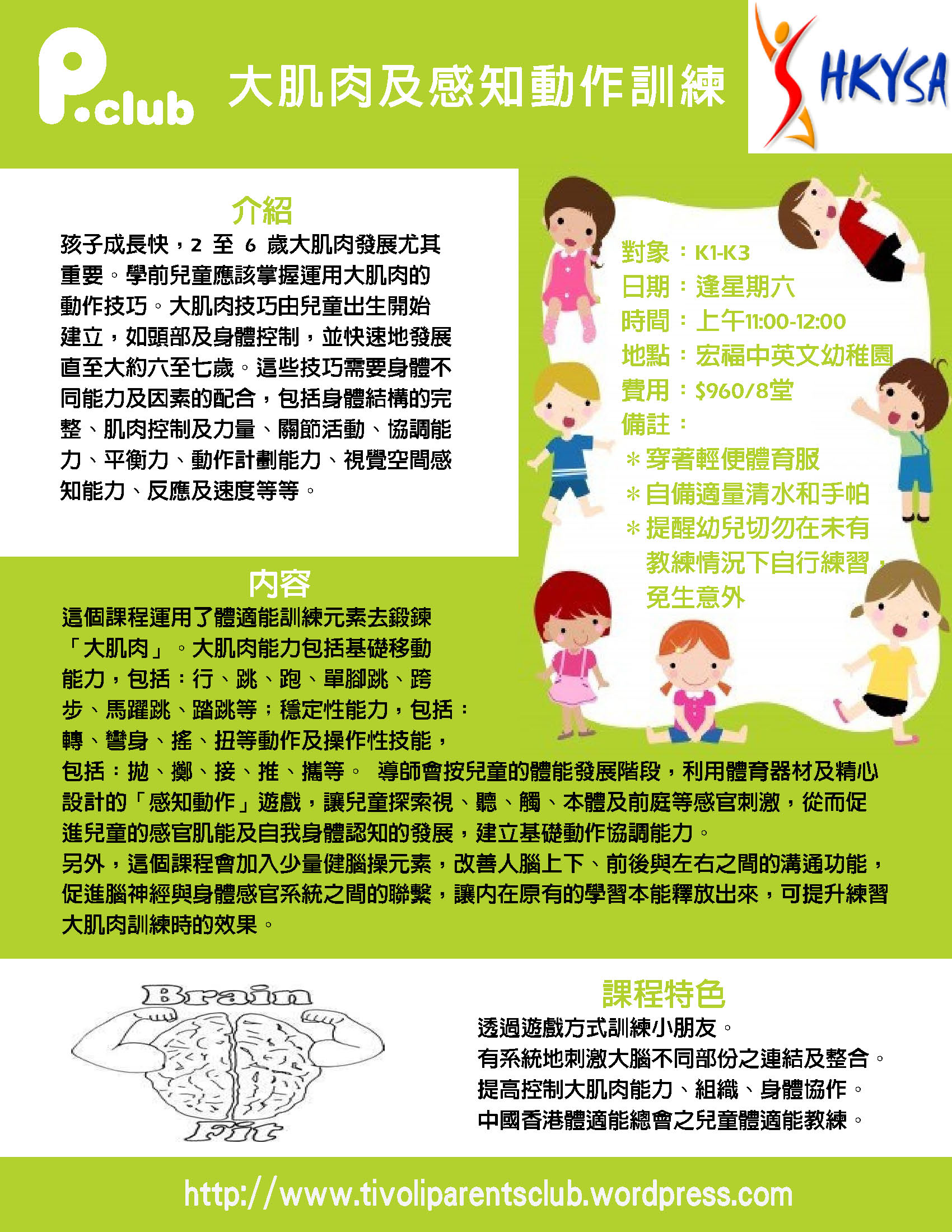 大肌肉及感知動作訓練 現正招生 20/11/201307/09/2016 Tivoli Parents' Club 本會資訊 大肌肉及感知動作訓練 逢星期六 上午11:00-12:00 $960/8堂 第一期 NOV 23, 30,DEC 7, 14, JAN 4, 18, 25, FEB 15 按此網上報名 Click to email a link to a friend (Opens in new window) Email Click to print (Opens in new window) Print More Click to share on Reddit (Opens in new window) Reddit Click to share on X (Opens in new window) X Like Loading... Related