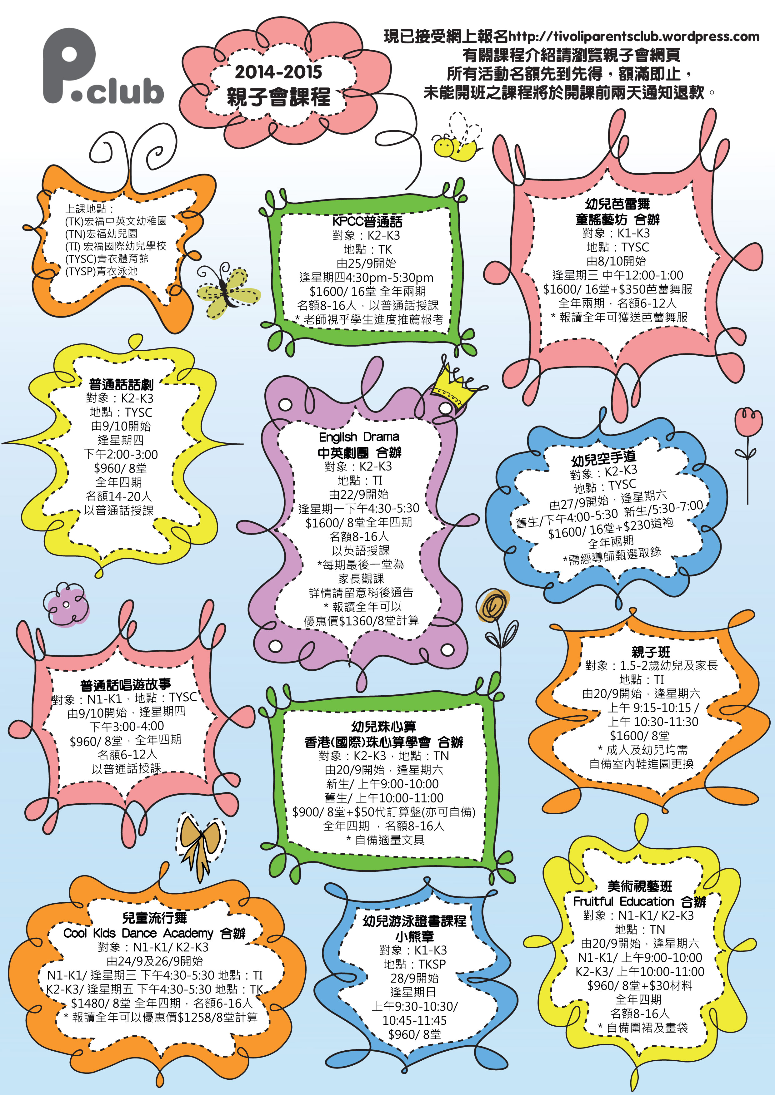 2014-2015親子會興趣班 現正接受報名 29/07/201426/01/2015 Tivoli Parents' Club 本會資訊 按此網上報名 更新日期:3/9/2014 15:46 美術視藝班及幼兒珠心算上課時間已作調整,敬請留意! Click to email a link to a friend (Opens in new window) Email Click to print (Opens in new window) Print More Click to share on Reddit (Opens in new window) Reddit Click to share on X (Opens in new window) X Like Loading... Related