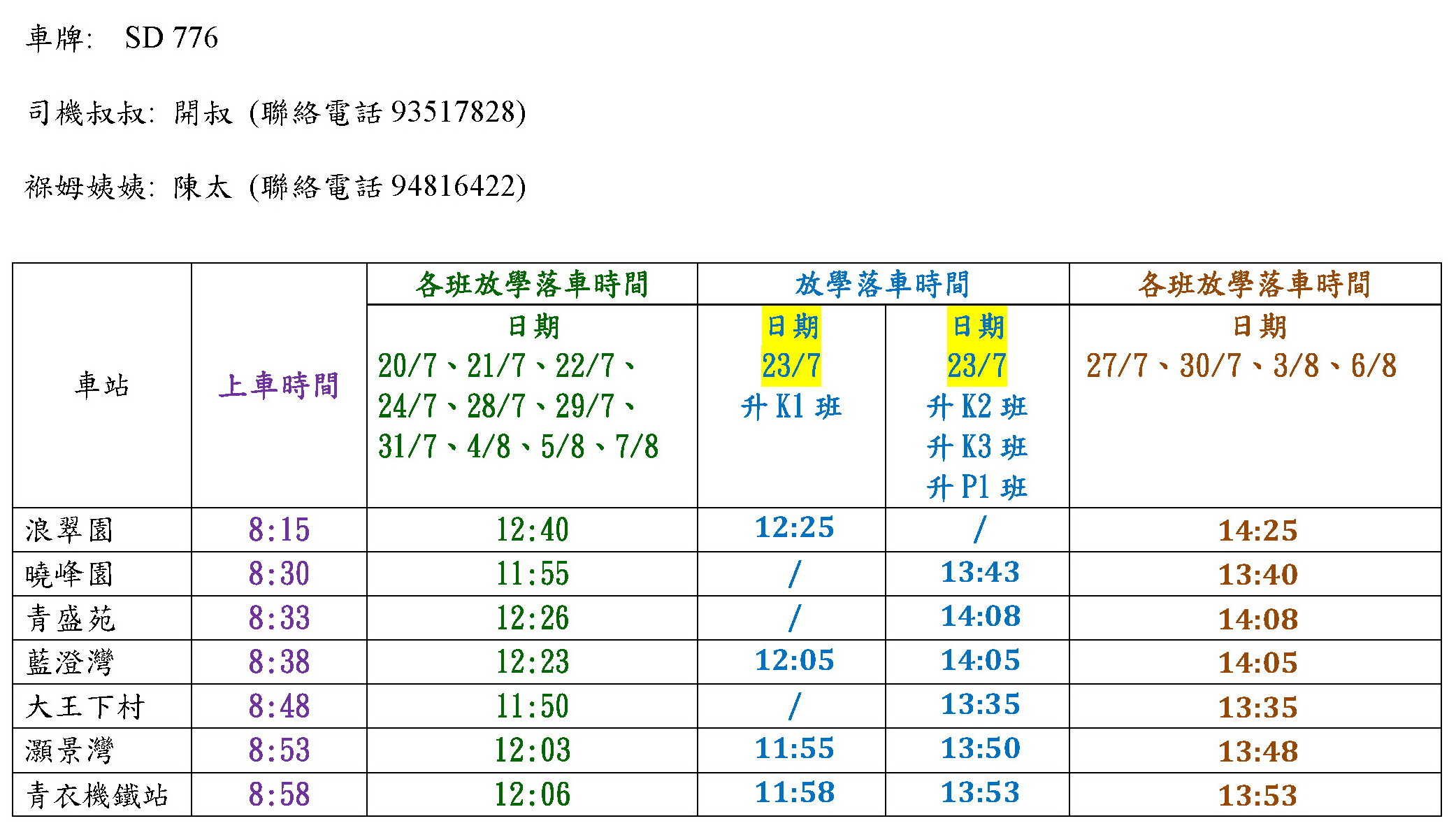 - 如早前已申請校車接送服務者將於13/7-18/7期間接獲校車司機直接致電聯絡,有關校車資料如下: