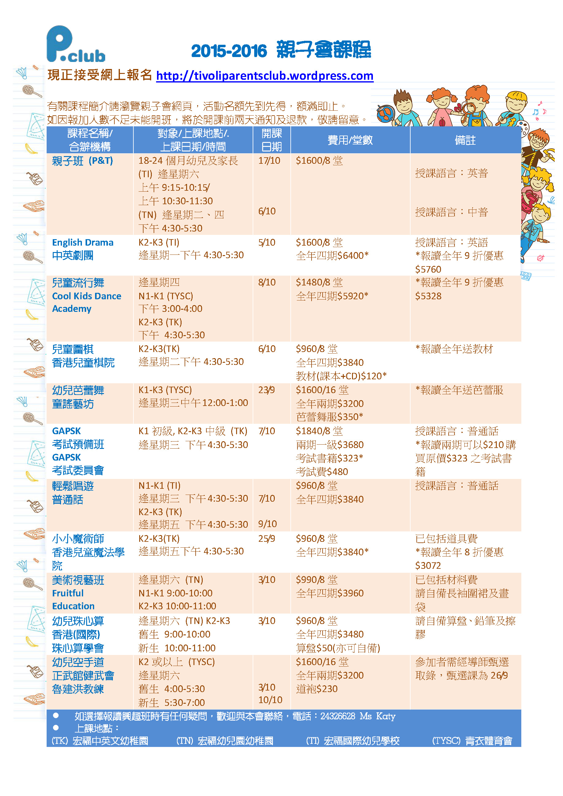 由於wordpress系統維護,以致本會之網上報名系統由11/9/15中午12:00至15/9/2015早上10:00期間未能接受資料,現已通過測試及回恢正常,如貴家長於上述期間透過報上網名,煩請重新輸入(並於備註一欄註明"重入"),不便之處,敬請見諒!如有任何技術問題,歡迎致電24326628與Ms Katy聯絡