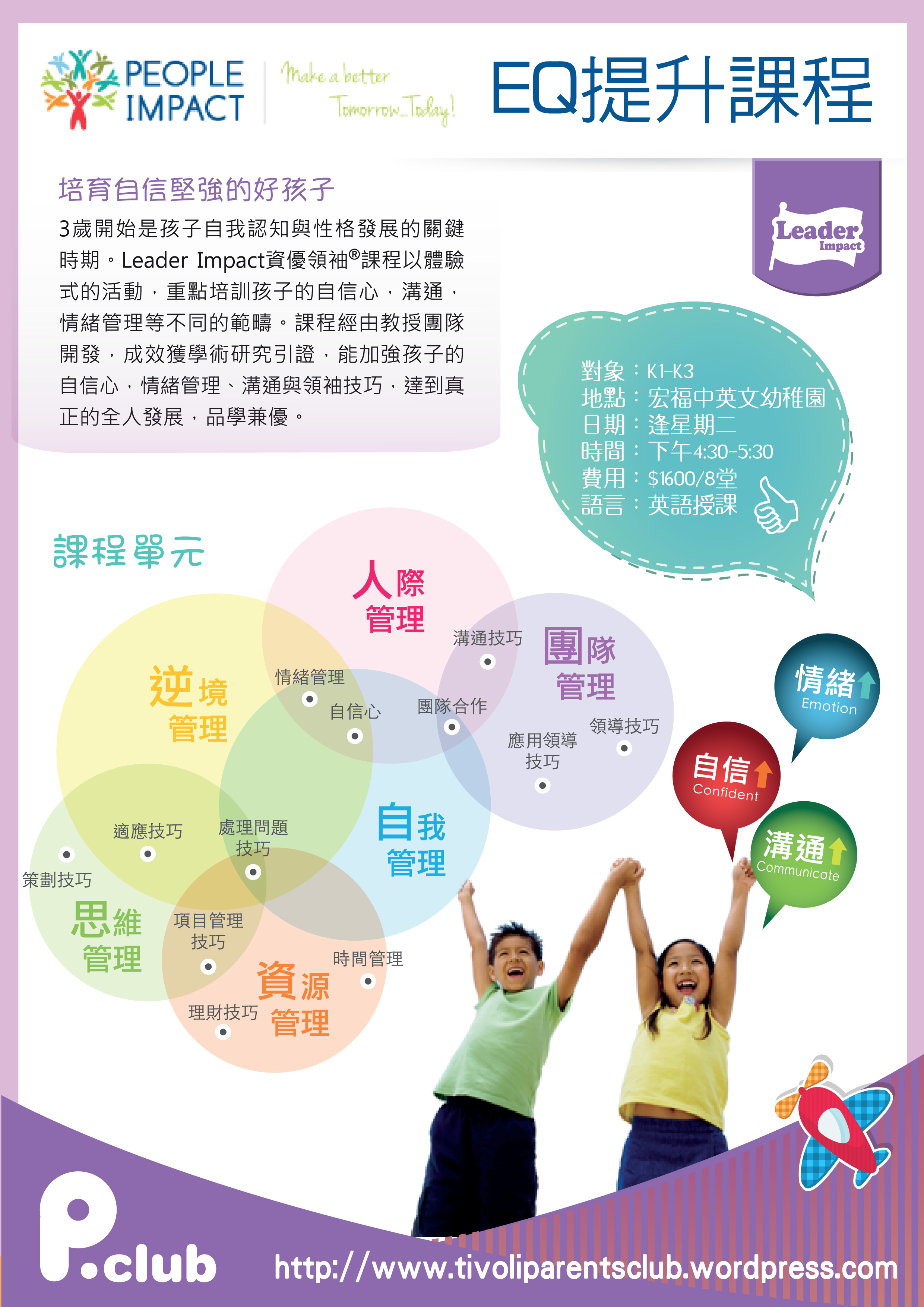 2014暑期活動 Image 22/05/201419/07/2014 Tivoli Parents' Club 暑期活動 現正接受報名! <接此網上報名> 名額有限,請留意以下公佈: 幼兒游泳證書(小熊章)—已滿,加開21/7-25/8逢星期一,三,五班 中英劇團—已滿 Cool Kid兒童流行舞—已滿,加開2:00-3:00,對象為升K2或以上